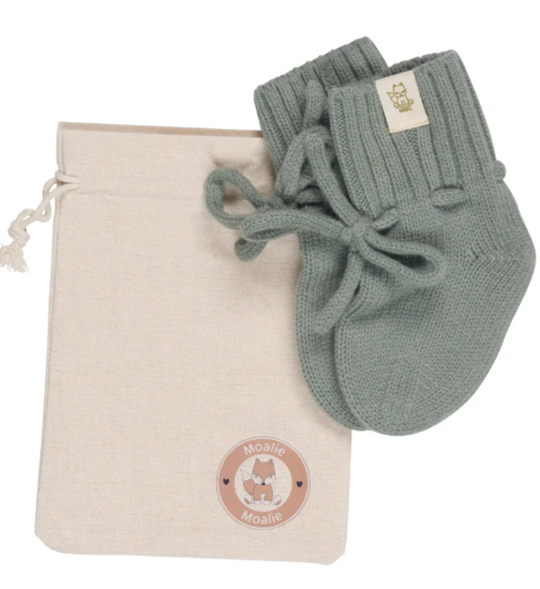 De Sage slofjes brengen een frisse, zachte groentint in de outfit van je kindje. De blend van 90% merinowol en 10% cashmere houdt de voetjes warm, ademt goed en voelt zacht aan.