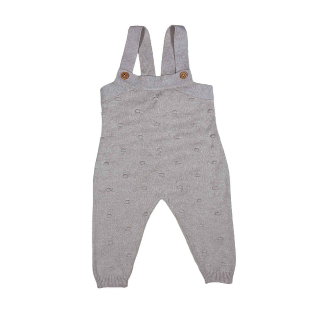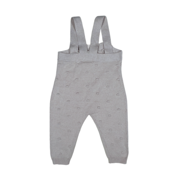 Onze tuinbroek is gemaakt van hoogwaardig breiwerk met een noppenstructuur in beige gemêleerd. De broek kan in de lengte groeien door de pijpen op te rollen en is tevens in lengte te verstellen met twee houten knopen.